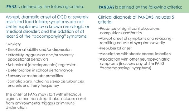 The acute onset means a Y-BOCS (Yale Brown Obsessive-Compulsive Scale) score of >20 and or a Chronic Tic Disorder YGTSS (Yale Global Tic Severity Scale) often with multiple tics. Below is the symptom criteria for PANDAS. Additional symptoms may be present.