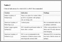 Eighty-nine articles were identified. Many reports repeatedly emphasized the importance of recognizing that epilepsy is a clinical diagnosis and that EEG is not required for making the diagnosis or initiating treatment. EEG offers significant value in several settings. See Table 1. There is also clear evidence to indicate that EEG is not indicated in several clinical settings. See Table 2.