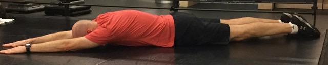 • Lay prone on the floor with arms and legs stretched out as far as possible. (Fig. 1, 2)