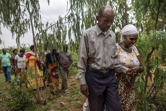 In Ramiro, Rwanda, Cyrille Namubonye, a genocide perpetrator, walks with survivor Maria Nyirambarushimana during a Karuna Center for Peacebuilding workshop aimed at building trust and forgiveness. “In their process of healing, Cyrille realized he needs Maria, and Maria realized she needs Cyrille,” says Rosette Sebasoni, Karuna’s project manager there.