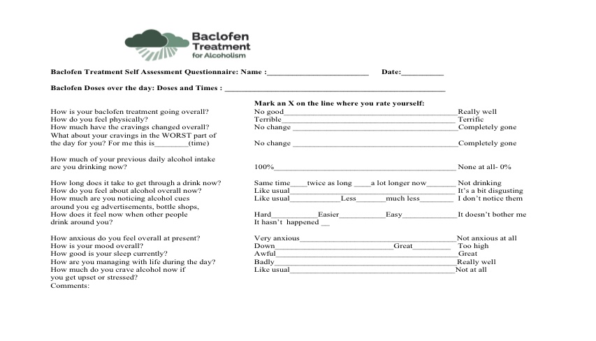 The first evaluation of the effect of baclofen in a patient will be at the 10mg tds or 30mg/day dose. There is a patient self evaluation sheet in the patient starter pack which can be brought to each consultation. Patients will generally have noticed some effect from the baclofen, generally on their anxiety and sometimes on their attitude to alcohol.