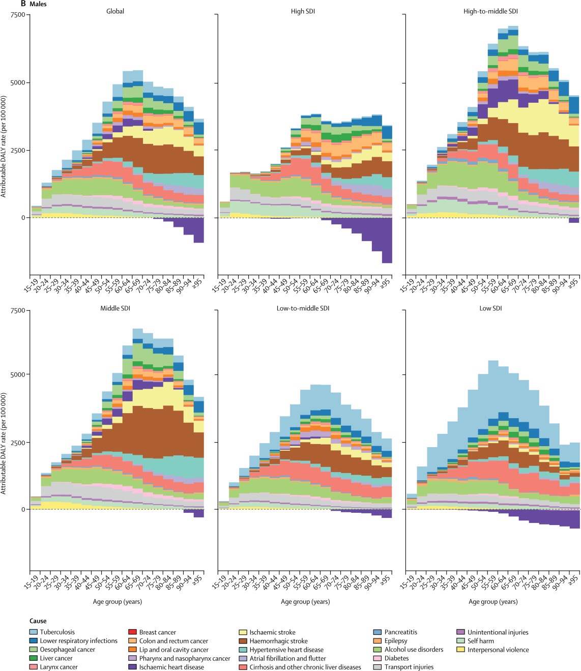 For both males and females, health outcomes comprising the attributable burden changed across the lifespan (figure 3). The three leading causes of attributable deaths in this age group were tuberculosis (1·4% [95% UI 1·0–1·7] of total deaths), road injuries (1·2% [0·7–1·9]), and self-harm (1·1% [0·6–1·5]). For females aged 15–49 years, alcohol use disorders constituted the largest proportion of the attributable burden across SDI quintiles; the primary exception was tuberculosis, which accounted for the largest proportion of attributable burden in low SDI settings. In this age range, transport injuries and alcohol use disorders were the predominant causes of attributable burden for males in high-to-middle SDI quintiles; for low-to-middle SDI and low SDI quintiles, tuberculosis was the primary cause of the attributable burden for both sexes.