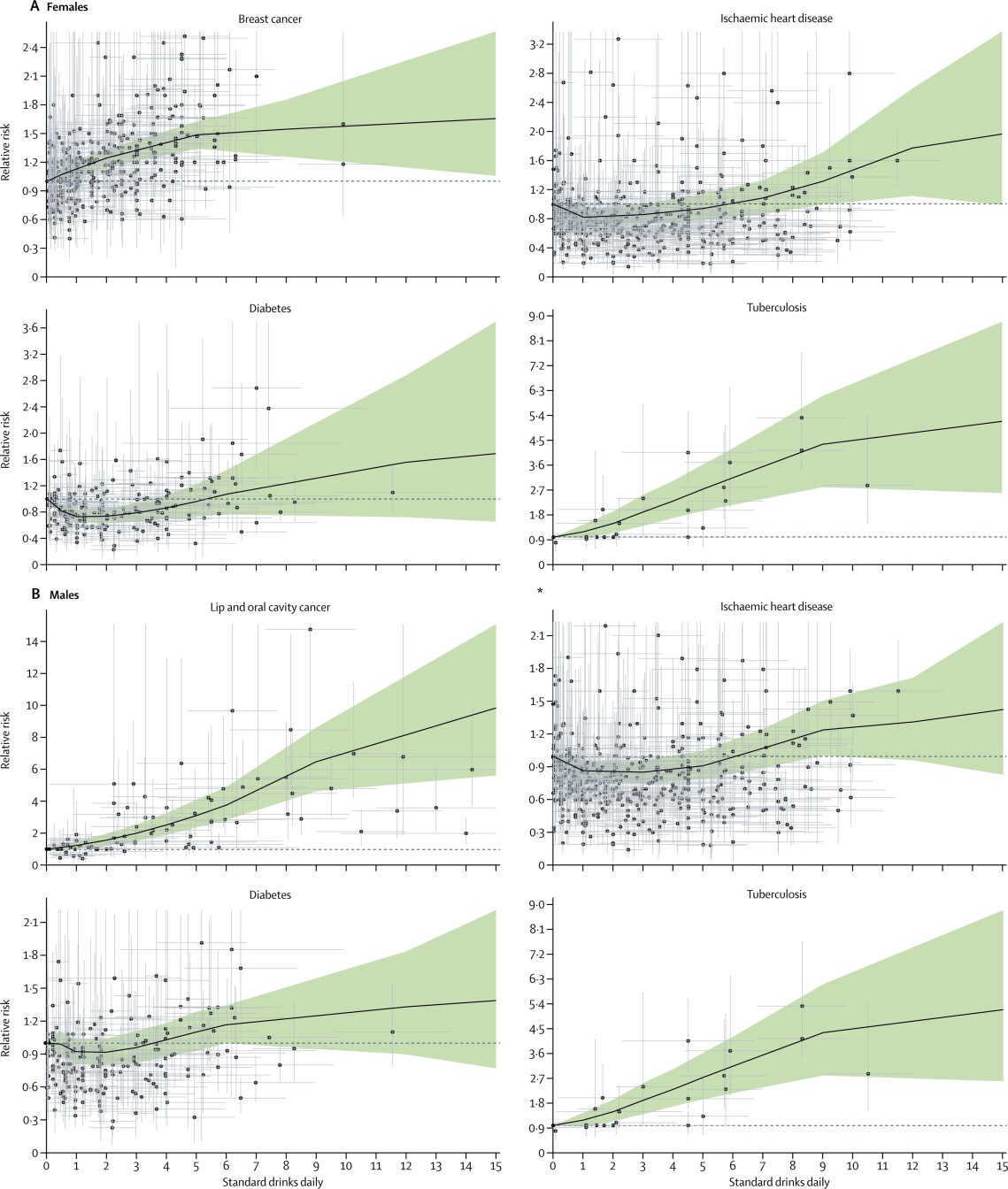 Previous research has analysed all-cause risk due to alcohol use by either investigating all-cause risk in particular cohorts and survey series, or through meta-analyses of those studies.26, 27 Past findings subsequently suggested a persistent protective effect for some low or moderate levels of alcohol consumption on all-cause mortality. However, these studies were limited by small sample sizes, inadequate control for confounders, and non-optimal choices of a reference category for calculating relative risks. More recent research, which has used methodologies such as mendelian randomisation, pooling cohort studies, and multivariable adjusted meta-analyses, increasingly shows either a non-significant or no protective effect of drinking on all-cause mortality or cardiovascular outcomes.7, 14, 28 Our results on the weighted attributable risk are consistent with this body of work. Taken together, these findings emphasise that alcohol use, regardless of amount, leads to health loss across populations. Although we found some protective effects for ischaemic heart disease and diabetes among women, these effects were offset when overall health risks were considered—especially because of the strong association between alcohol consumption and the risk of cancer, injuries, and communicable disease. These findings stress the importance of assessing how alcohol use affects population health across the lifespan.