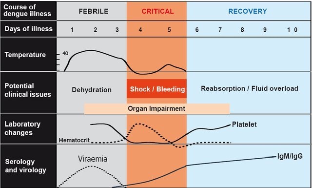 A normal recovery pattern of dengue infection (clinical course) as shown in figure above has the same timeline as the two studies showing papaya drug and control groups.