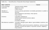 Intermittent neurologic symptoms comprise a group of complaints that may be associated with dysfunction of many organ systems, including the central nervous system, cardiovascular system, and vestibular apparatus. Intermittent metabolic disturbances and psychiatric problems may also result in neurologic symptoms. Despite these diverse etiologies, all the conditions discussed here share the following features: (1) They are intermittent; (2) they are recurrent; (3) they are usually brief, lasting minutes to hours; (4) the patient is usually asymptomatic between attacks; and (5) the symptoms are usually stereotyped for an individual patient.