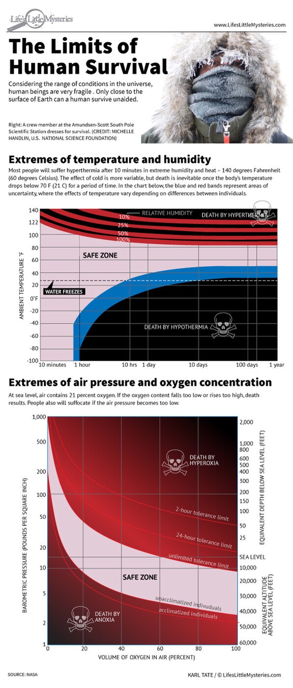 Individuals vary greatly in how well they tolerate departures from normal atmospheric conditions, whether these are changes in temperature, pressure or oxygen content of the air. Bounds of survival also depend on how slowly environmental changes set in, because the body can gradually adjust its oxygen usage and metabolism in response to external conditions. But some rough estimates of our breaking points can be made.