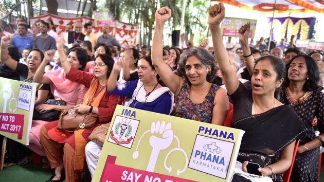 Doctors demonstrate against the Karnataka Private Medical Establishments (Amendment) Bill 2017, Bengaluru, November 16 (Arijit Sen/HT File Photo)