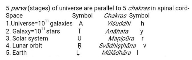 Primordial mind of space was in vacuum (śvo-vasīyasa)-corresponding to sahasrāra chakra with 1000 alternatives of creation. When it desired creation, there was duality of matter, corresponding to Ājñā chakra, at center of brain. Number of cells in brain are 1011, equal to galaxies in universe or stars in our galaxy (Śatapatha brāhmaņa 10/4/4/2, 12/3/2/1, 5). Thus, all are physical mind. Rotation of galaxy is called Manvantara of 31 crore years. Solar system gives energy for creation and mind, so it controls intellect. Field of distance stars is affected by moon, nearest to us, so it controls fluctuations of mind.