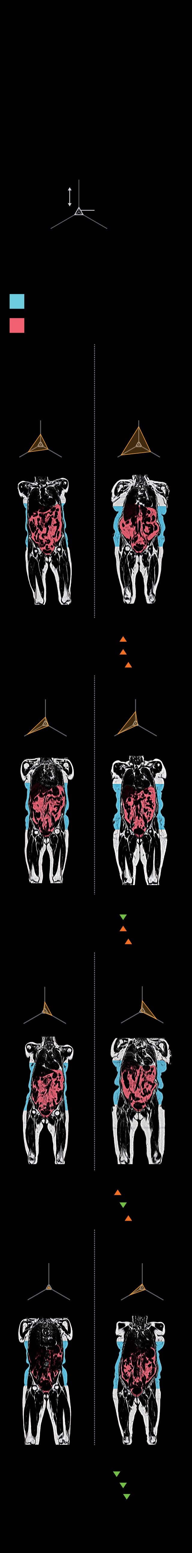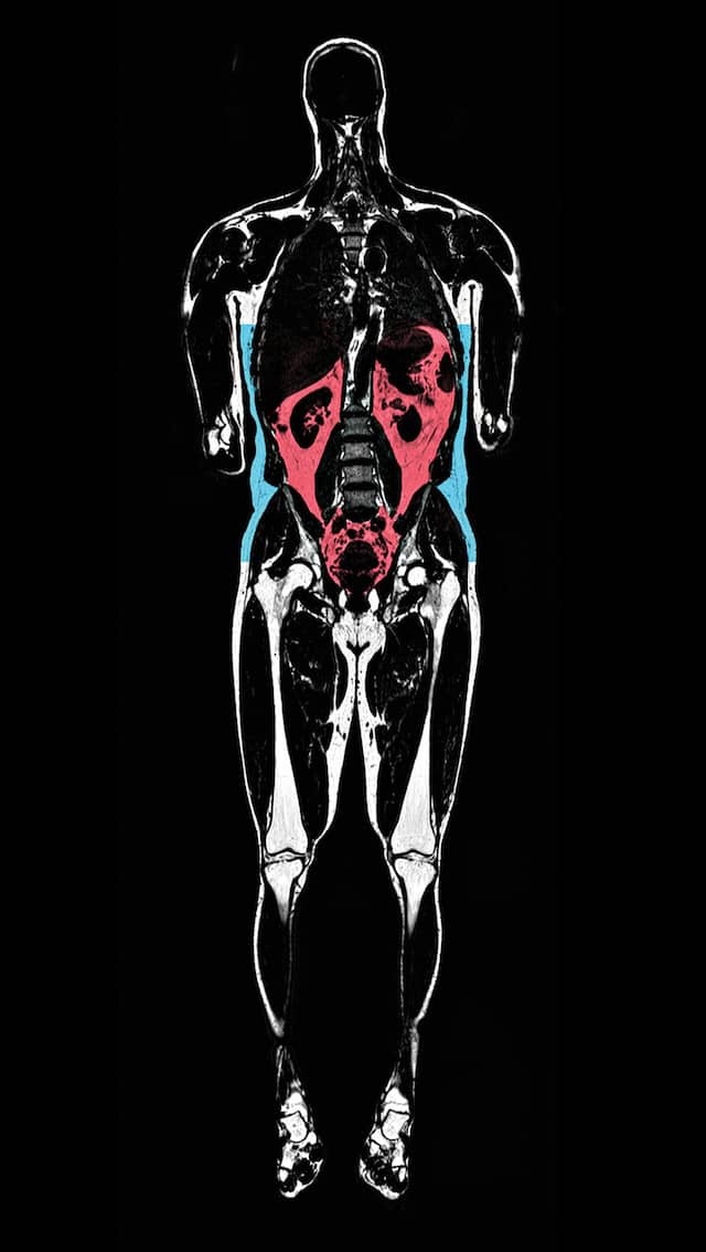 MRIs performed on some Biobank participants create 3D images that show subcutaneous fat under the skin in blue and visceral fat around the organs in red. Visceral fat has been linked to diseases. (See graphic below.)
