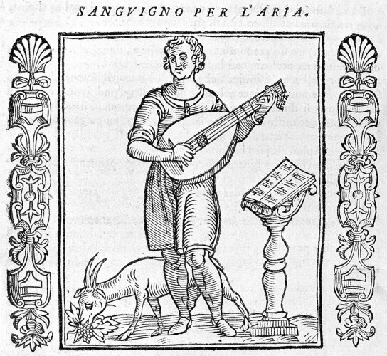 Lutenist corresponding to temperament based on sanguine humour. Woodcut