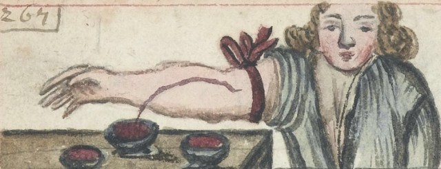 Bloodletting illustration from a compendium of popular medicine and surgery, receipts, etc. by Arzneibuch ca. 1675. Wellcome Library reference: MS. 990.