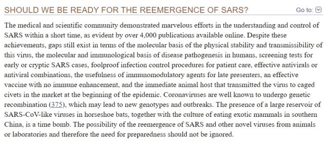 Regarding the spread of the first SARS epidemic, the paper stated, “The rapid economic growth in southern China has led to an increasing demand for animal proteins including those from exotic game food animals such as civets. Large numbers and varieties of these wild game mammals in overcrowded cages and the lack of biosecurity measures in wet markets allowed the jumping of this novel virus from animals to human.” It added, “The small reemergence of SARS in late 2003 after the resumption of the wildlife market in southern China and the recent discovery of a very similar virus in horseshoe bats, bat SARS-CoV, suggested that SARS can return if conditions are fit for the introduction, mutation, amplification, and transmission of this dangerous virus.”