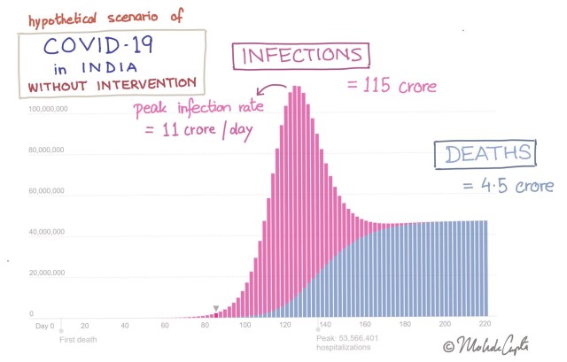 This is what happens if no interventions are done to control coronavirus spread, ie, the worst case scenario for India. About 115,00,00,000 (115 crore) people are infected in total, which is about 85% of India’s population. In the process, the health system is overwhelmed and people lose their lives en-masse: total deaths ~ 4,50,00,000 (4.5 crore). This happens across a span of about 6 months, assuming a hypothetical scenario where no interventions are done at all and the disease is allowed to spread freely.