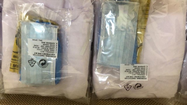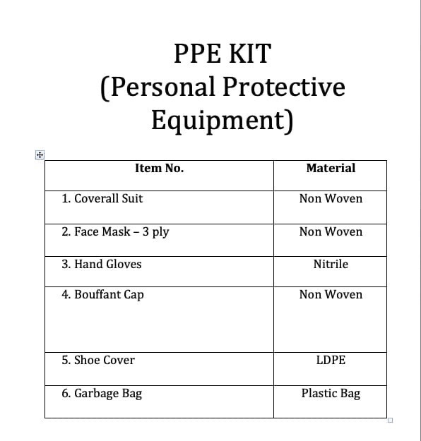 •Each Kit includes: Coverall Suit, Face Mask, Hand Gloves, Bouffant cap, Shoe cover, Garbage bag