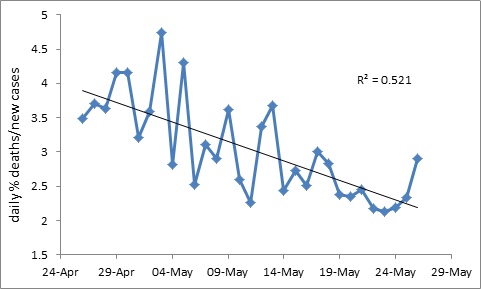 The same is happening in India too. In fact, the case fatality rate in India was always low and it is decreasing further, although the absolute number of deaths per day has not started decreasing yet.
