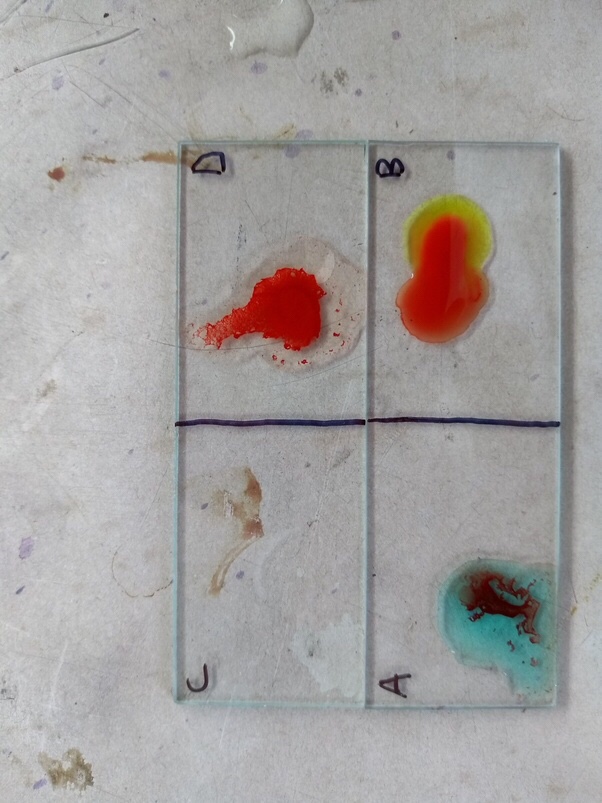 ( The Blood group determination expt. Aaahhhhhh….. I liked to do this one, no worries of making that smear and the colours are so vibrant, looks quite similar to the Gems. )