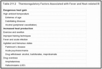 A number of factors (Table 211.2) may alter the normal thermoregulatory response. They may lead directly to hyperthermia (heat-related illness) or, in the case of EP-mediated fever, may be responsible for prolongation of fever and the development of extreme temperature elevations. Excess heat is dissipated by radiation, conduction, and convection via hypothalamic-mediated cutaneous vasodilation and increased cardiac output. Evaporation heat loss requires an intact sweating mechanism as well as hypothalamic input. When ambient air temperature becomes 35°C or higher, neither conduction nor radiation is effective. High humidity limits heat loss by vaporization.