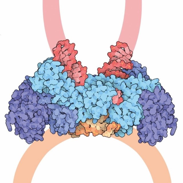 Two molecules of the ‘cut and paste’ enzyme transposase (blue and purple) grip onto the free ends of a DNA transposon (pink), ready to insert within a new site in the genome.