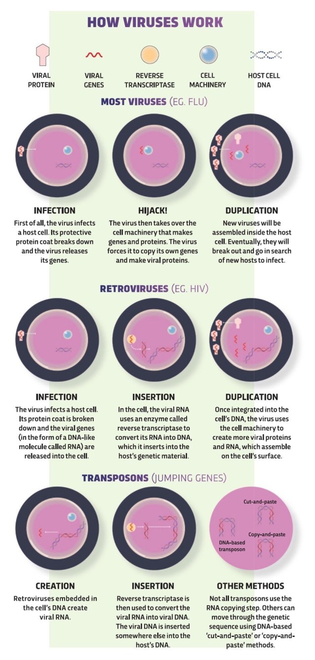 Over millions of years, these viral DNA sequences randomly mutate and change, losing their ability to break free from their host cells. Trapped inside the genome, some of these ‘endogenous’ retroviruses can still jump around while others are stuck forever where they last landed.