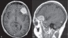 Dural tail sign. Axial (A) and sagittal (B) contrast-enhanced MRI images of the brain show an avidly enhancing lesion in the left frontal region. The lesion is dural based and there is thickening and enhancement of the dura, which tapers away from the …