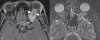 Optic nerve tram-track sign. Postcontrast T1W axial MRI image of the orbits (A) shows an enhancing mass (thick small arrows) around the left optic nerve. The optic nerve (thin long arrow) itself is not enlarged and is nonenhancing. This is suggestive …