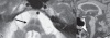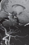Tau sign. Sagittal T1-W image of the brain shows (A) flow voids of the internal carotid artery (ICA) in the precavernous segment (thick short arrow), in the cavernous segment (medium-sized arrow), and a persistent trigeminal artery (thin long arrow). …