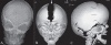Harlequin appearance of the orbit represents the elevation of the superolateral angle of the orbit along with a flat frontal bone on a plain radiograph [Figure 19A–C].[23] It is seen in coronal craniosynostosis, where the anteroposterior growth of the skull is limited. There is also relative increase in the transverse diameter of the skull, which is called brachycephaly. The orbit is shallow, the lesser wing of the sphenoid is elevated, and the greater wing is expanded. The innominate line (superior border of the greater wing of the sphenoid) appears as a dense ridge. The sign can be unilateral or bilateral.