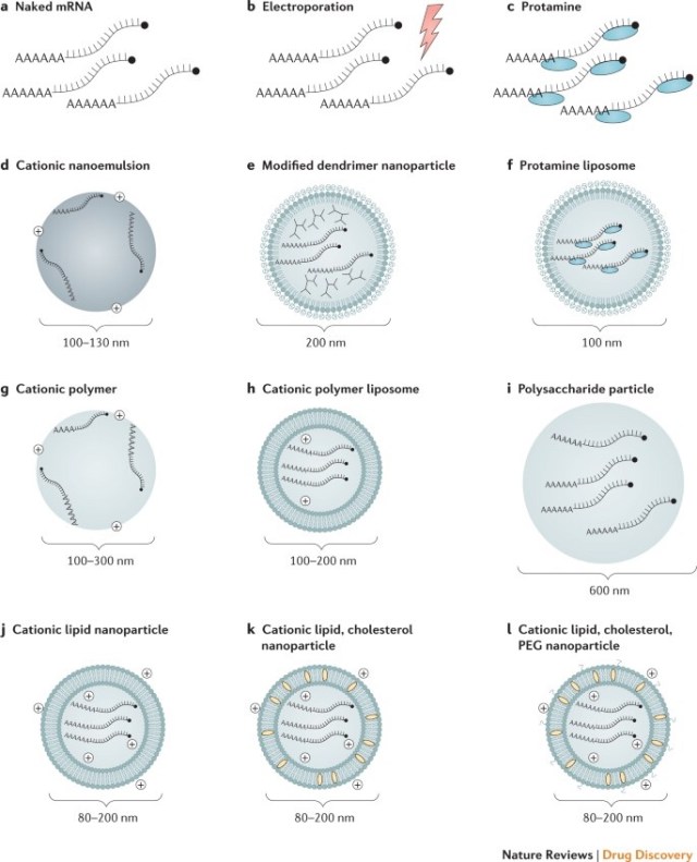 Commonly used delivery methods and carrier molecules for mRNA vaccines along with typical diameters for particulate complexes are shown: naked mRNA (part a); naked mRNA with in vivo electroporation (part b); protamine (cationic peptide)-complexed mRNA (part c); mRNA associated with a positively charged oil-in-water cationic nanoemulsion (part d); mRNA associated with a chemically modified dendrimer and complexed with polyethylene glycol (PEG)-lipid (part e); protamine-complexed mRNA in a PEG-lipid nanoparticle (part f); mRNA associated with a cationic polymer such as polyethylenimine (PEI) (part g); mRNA associated with a cationic polymer such as PEI and a lipid component (part h); mRNA associated with a polysaccharide (for example, chitosan) particle or gel (part i); mRNA in a cationic lipid nanoparticle (for example, 1,2-dioleoyloxy-3-trimethylammoniumpropane (DOTAP) or dioleoylphosphatidylethanolamine (DOPE) lipids) (part j); mRNA complexed with cationic lipids and cholesterol (part k); and mRNA complexed with cationic lipids, cholesterol and PEG-lipid (part l).