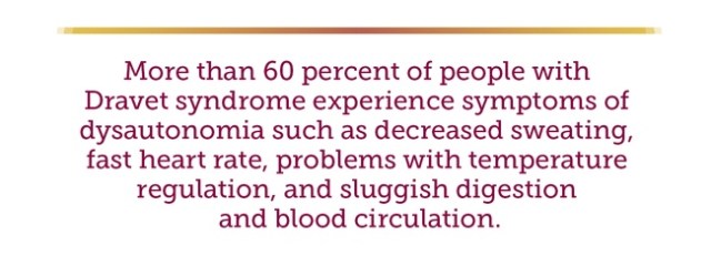 More than 60 percent of people with Dravet syndrome experience dysautonomia. Symptoms of dysautonomia include problems with temperature regulation, decreased sweating, fast heart rate (tachycardia), and sluggish digestion and blood circulation. About 60 percent of children with Dravet syndrome also show growth and nutrition issues. Many have other health problems, including sleep issues and frequent infections.