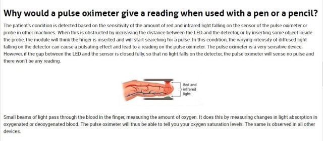 One of the major oximeter manufacturing companies in India, BPL, has dedicated a blog to clarify misconceptions related to oximeters. The reason behind oximeters giving a reading when used with a pen or pencil has been explained here.