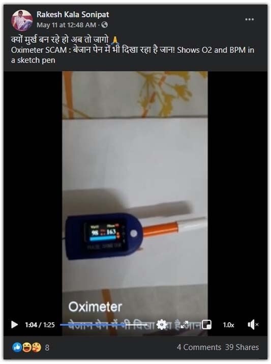 A Facebook user shared this video with the caption, “Beware, don’t be tricked. Oximeter scam: A lifeless pen is also showing signs of life. Shows O2 and BPM in a sketch pen.”