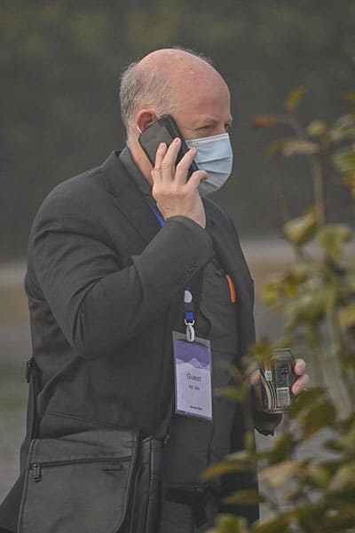 Peter Daszak, a member of the World Health Organization (WHO) team investigating the origins of the COVID-19 coronavirus, talks on his cellphone at the Hilton Wuhan Optics Valley in Wuhan. (Photo by HECTOR RETAMAL/AFP via Getty Images)