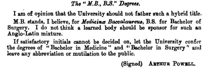 The M.B. was a familiar degree, and so was the B.S. (Bachelor of Surgery), especially in the U.K. So the Bombay University officials seem to have amalgamated these two Bachelor’s degrees to create this neologism. It is not clear, however, if they were inspired by any other place which also granted the MBBS around this time. To be sure, the neologism was not appreciated by everybody. Here is one senate member dissenting: