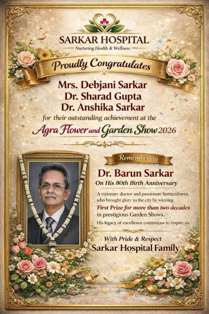 आगरा : सरकार हॉस्पिटल को यह घोषणा करते हुए अत्यंत हर्ष और गर्व का अनुभव हो रहा है कि हमारे प्रतिष्ठित सदस्य — श्रीमती देबजानी सरकार, डॉ. शरद गुप्ता एवं डॉ. अंशिका सरकार — ने आगरा फ्लॉवर एंड गार्डन शो 2026 में उत्कृष्ट प्रदर्शन कर उल्लेखनीय सफलता अर्जित की है। इस उपलब्धि ने न केवल संस्थान का, बल्कि पूरे आगरा शहर का गौरव बढ़ाया है।
