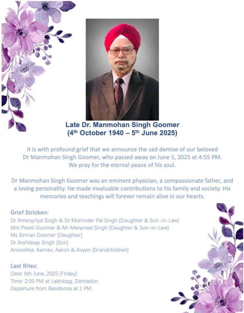 This morning, at 5 a.m., on 5 Th of June 2025, Dr. Manmohan Singh Goomer suffered a cardiac arrest and passed away, joining his beloved Seema. The news would have rippled through Dehradun, stirring memories of a man who was more than a doctor—he was a pillar of the community. Those who knew him might recall his booming voice, his unwavering kindness, or the way he’d slip a sweet to a child after a check-up, saying, “Bravery deserves a reward!” His death closes a chapter on a life dedicated to healing, marked by a quiet dignity and a legacy that will linger in the hearts of those he touched.