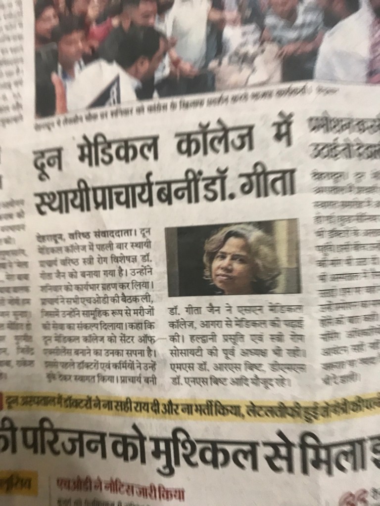 Dr. Geeta Jain is a distinguished medical professional an alumnus of SN Medical college Agra and the permanent Principal of Government Doon Medical College in Dehradun, Uttarakhand. An MS obstetrician and gynaecologist she was the president of Haldwani obstetrician and gynaecologist society. Her professional journey reflects a deep commitment to advancing medical education and healthcare in the region.