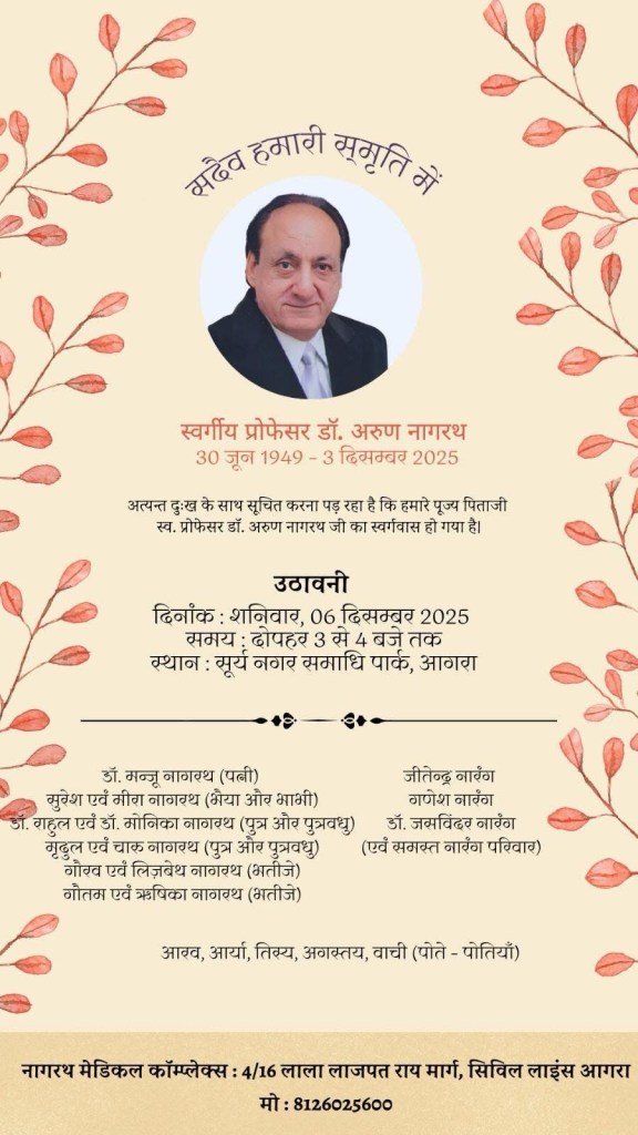 The Shavyatra will proceed to Tajganj Crematorium from the family residence at 4/16 Bagh Farzana, Agra, on Wednesday, 3rd December 2025, at 2:00 p.m.